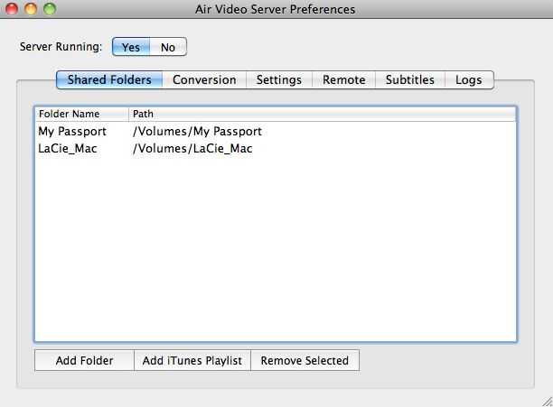 Dispositivo central servir vídeo debe ejecutar servidor de "Vídeo de aire". Se trata de un software libre disponible en http://www.inmethod.com/. Trabaja en plataformas Mac y PC. Se recomienda que configurar el servidor con una contraseña segura para acceder a tus videos (en la pestaña de configuración).