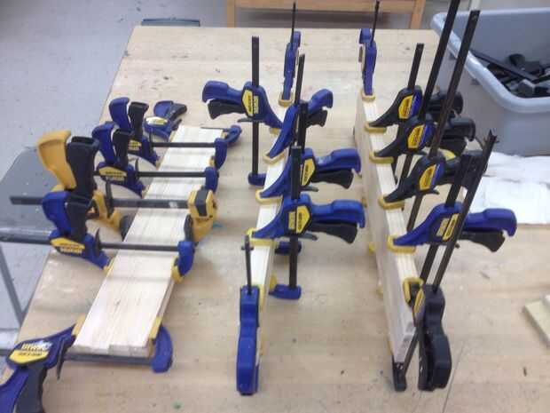 Con el uso creativo de los bloques de madera, pinzas y un martillo de goma, pegar cada conjunto más plana posible. Usé un tornillo de banco para mantener las tiras planas. El mejor pegamento para arriba, menos trabajo necesita una cepilladora para hacer.