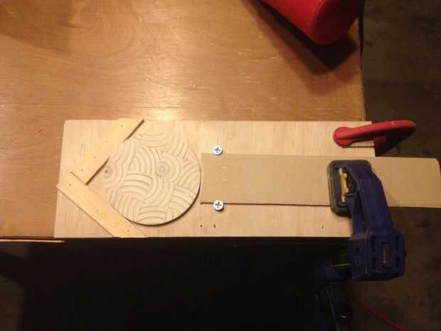 Después de lijar varios posavasos con la lijadora de banda superior de banco y con la mano, quería una manera más rápida y mejor, a la arena. Hice una plantilla simple para sostener una montaña así que pude usar una lijadora orbital. Como el la plantilla se fija a la mesa, la abrazadera tiene una tira de MDF que es empujar la montaña en la esquina. Los dos tornillos a cada lado del MDF impiden que abrochar para arriba. Todo se encuentra debajo de la superficie de la montaña para que no haya interferencias con la lijadora.