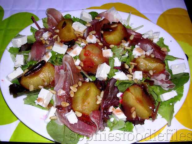 Usted puede encontrar aquí en mi blog: http://sophiesfoodiefiles.wordpress.com/2009/07/18/sophies-summer-salad-with-roasted-plums-sheeps-feta-pine-nuts-prosciutto-a-plum-dressing-some-latest-awards/