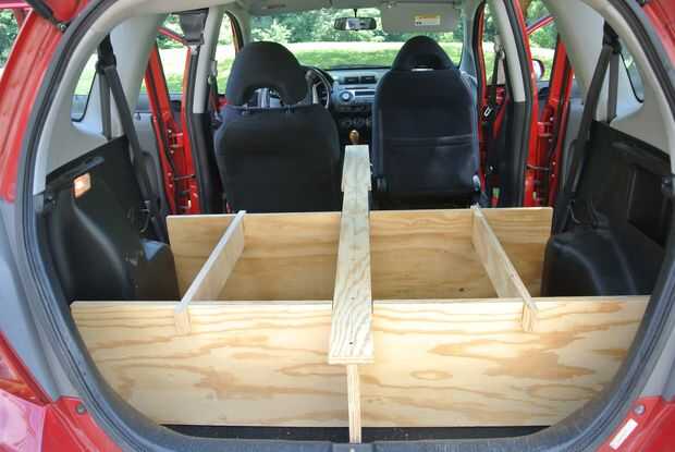 En primer lugar, construí una espina en forma de T que divide la cabina en dos con la parte superior de la T a nivel de la plataforma. Utilicé tornillos de 2 pulgadas y pegamento de madera para garantizar la forma de T. Para mi marco he utilizado contrachapado de ¾", porque sabía que sería resistente, y tenía en mano. Mi columna se basaba en el piso cerca de la parte trasera de la cabina y tenía un pie que se extiende hasta el piso de los pozos de asiento quitado. La parte superior de la T que abarcó desde la parte trasera de la cabina a como lejos delantero entre los asientos delanteros como sea posible sin hacer conducción incómoda. Para mí esto significó poder cambiar de puesto en 4to engranaje sin mi codo golpea la columna vertebral.