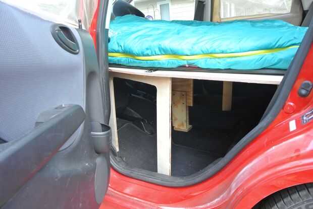 La última cosa que la plataforma debe ser estructuralmente, se apoya directamente detrás de los asientos en la parte delantera de la plataforma. Para éstos, simplemente medí la altura desde el piso del vehículo hasta la parte inferior de la plataforma justo detrás de la bisagra delantera y derecha detrás del asiento. Luego, utilizando ½" madera contrachapada, corté un soporte en forma de U con las patas siendo las longitudes. Puse en su lugar y comprobar para asegurarse de que la plataforma era nivel y adecuadamente apoyado por toda la cabina.