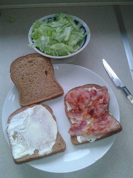 Difundir el mayo en el pan, añade un toque de pimienta negra, luego la pila en cuatro torreznos de tocino... MMMMmmm