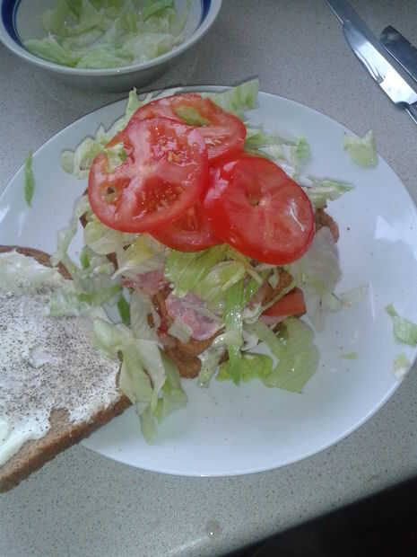ya lo tienes! más lechuga y el resto del tomate... el Mayo más... y encima la última rebanada de pan