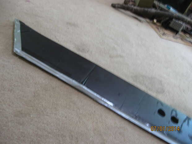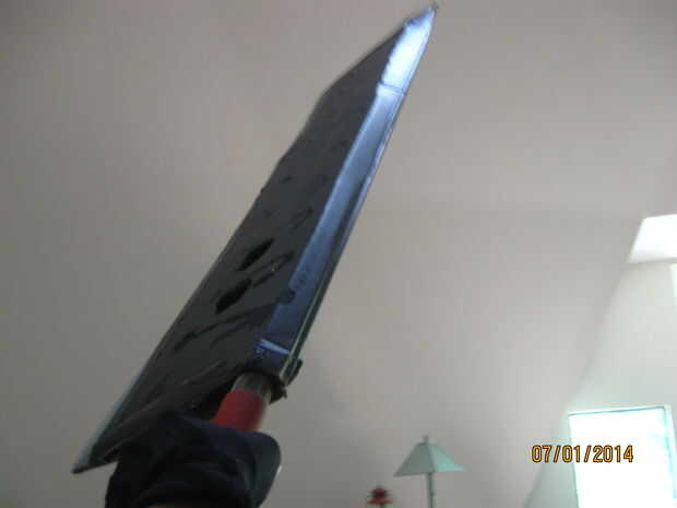 Esto hice con cartulina, un mango de pala de jardinería desechados (uno rojo), un montón de cinta adhesiva y pintura en aerosol negro. Una vez que tuve todos los materiales solo tomó 20 minutos para artesanía (cortar una forma de espada buster simétrica y pegado y doblado a la mitad sobre el mango de la pala luego aerosol pintado). Es realmente muy ligera y fácil de mantener, sólo asegúrese de que usar un mango ligero o lo voy a matar las manos.