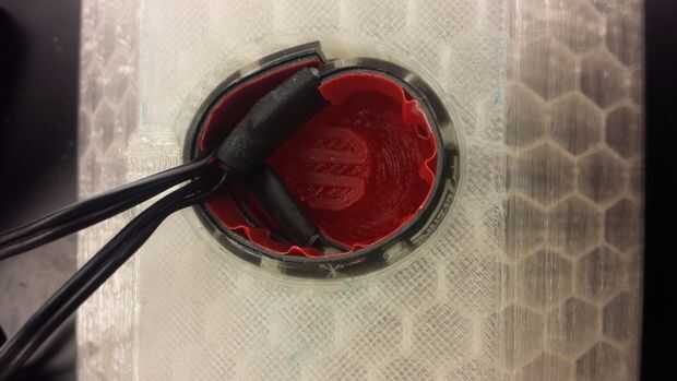 Debatí que color imprimir varias veces. Planeó originalmente utilizar un verde transparente. Una vez fui al LED verde, decidí usar un plástico claro realmente reinventar el diseño. El plástico transparente realmente muestra que un patrón hexagonal agradable de la impresión agrega una nueva dimensión. Temía que el verde sería oscuro para ver la esfera roja. También decide agregar algunos fieltro verde para cubrir la parte inferior y ocultar los cables. El verde ayuda a dar un color a la película de plástico transparente cuando no iluminados. Poco de pegamento para sostener a la tela en su lugar y el proyecto está terminado.