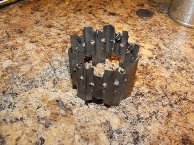 ¿Recuerde que la parte media de la can que guardaste? Este es el momento de salir este nuevo y convertirla en un soporte del pote. Usted necesitará utilizar el canal de la herramienta que prensa otra vez y doblar todo alrededor. Esto hará que el tamaño adecuado para caber en esa pequeña ranura en la parte superior de la lata. Brocas de taladro soporte de algunos agujeros en el bote, otra vez usando 1/8 y 1/16 pulgadas. algunos canales de aire adicionales necesitan ser cortados en la parte superior e inferior de la trébede para permitir oxígeno en.