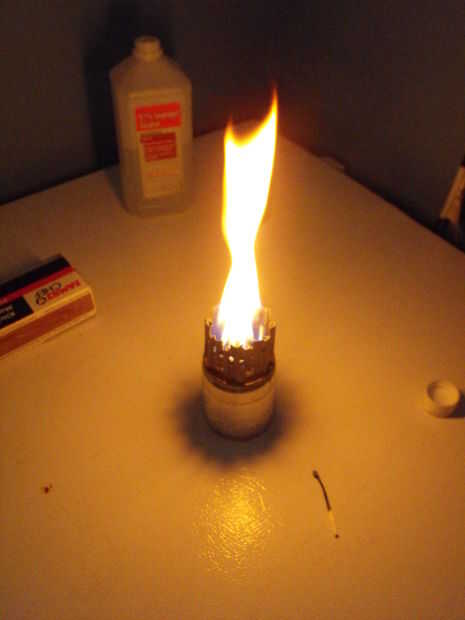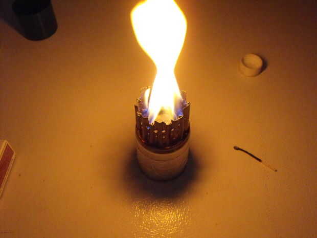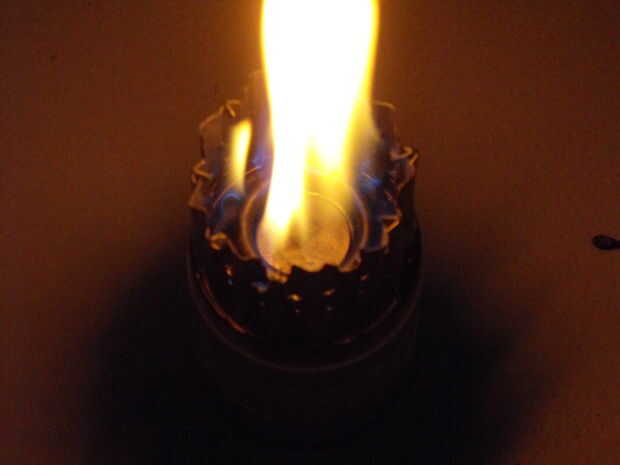 Las imágenes muestran a los segundos de cocina después de ser encendido. todavía hay un montón de alcohol en la parte superior de la lata, por eso la llama es tan alta. La llama los niveles hacia fuera a quemar cerca de 2 pulgadas sobre la trébede.