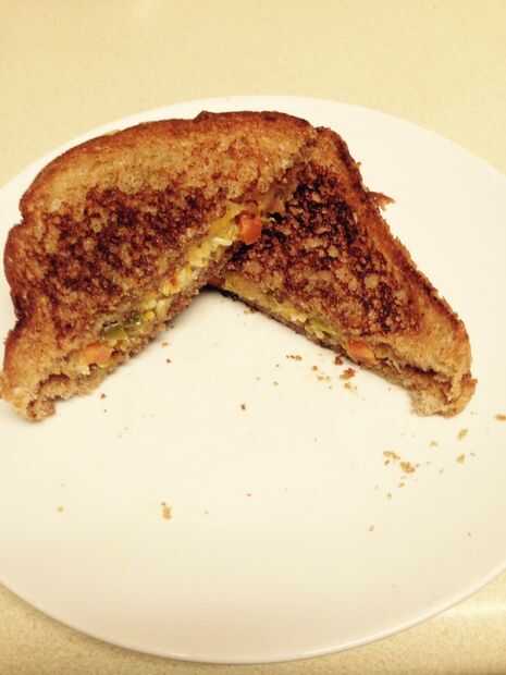 Una vez que los rellenos se derritan y se acaba el pan tostado, cuidadosamente saque el sandwich de la cazuela, cortar por la mitad y disfrutar! El sándwich es muy sabroso y se complementa bien si sumergido en salsa de tomate.
