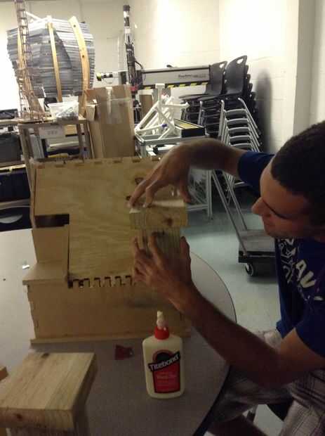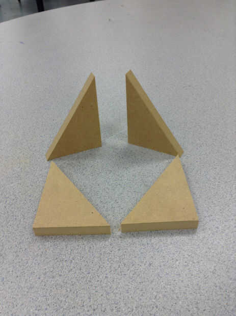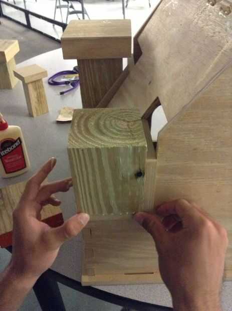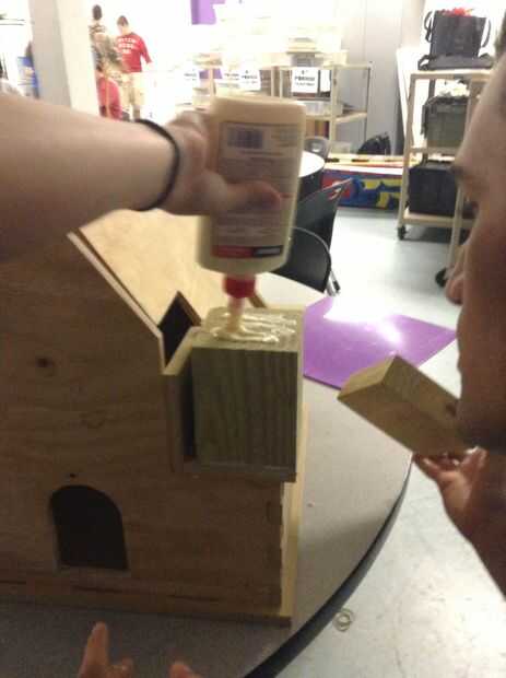 Utilice pegamento de madera para colocar las piezas base en las esquinas, a continuación, utilice el pegamento otra vez para colocar los triángulos en la base justo al lado de la azotea (ver imagen de referencia).
