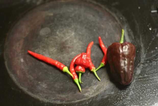Varios chiles de su elección (yo usé Inicio crecido Scotch bonetes y Naga Jolokias Chihuacle Negros)