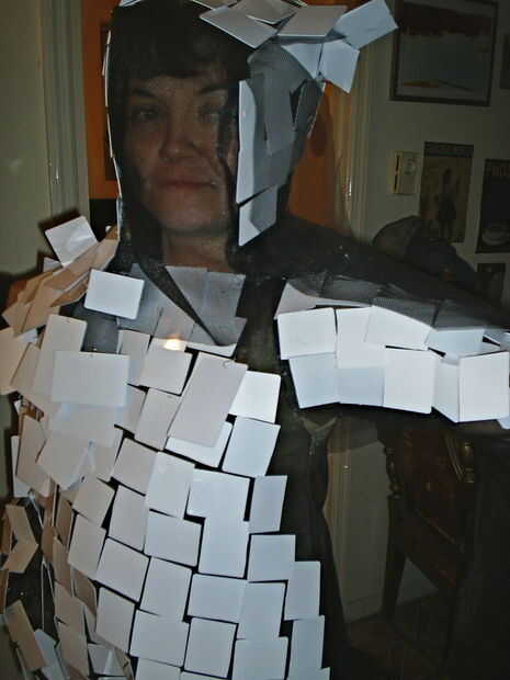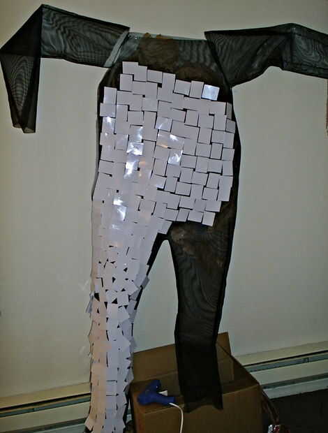 Para dar la campana una pixelada de píxeles "que fluye", comencé con la parte inferior de la campana y capas para arriba. Esto es opcional y consiste en perforar los agujeros en las tarjetas luego adjuntarlos con alambre pequeño.