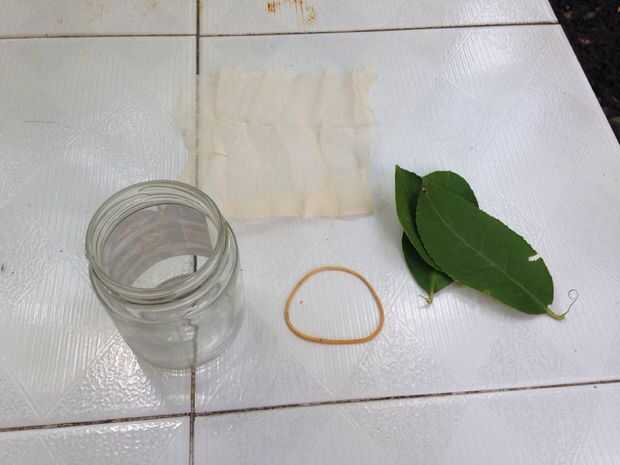 Todo lo que necesita es un frasco de vidrio vacío, una banda de caucho, algunas hojas de su oruga, oruga (por supuesto) y una gasa.