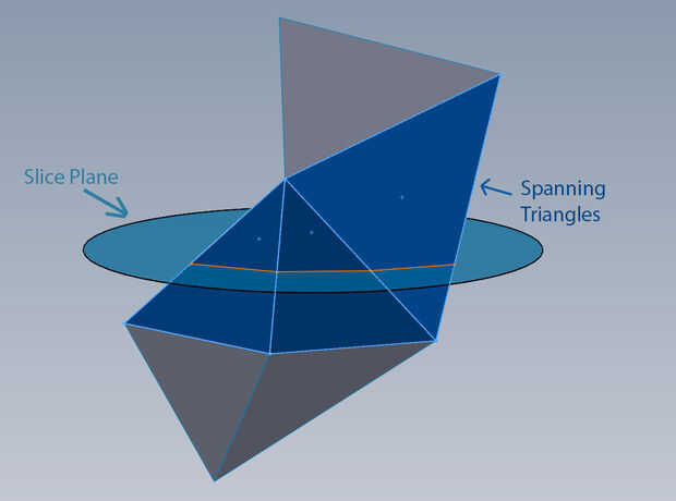 - Para altura de z de cada rebanada, encuentra los triángulos que abarcan esa rebanada. Uno o dos vértices tendrá valores de z superiores a ese segmento. Uno o dos vértices será menor.