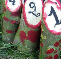 Decoramos la longitud de bolos con colores brillantes, para verlos mejor en hierba (la madera conseguimos tenía el mismo color que la hierba de la zona de juego).