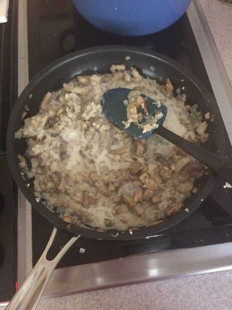 Revolver constantemente hasta que las setas empiezan a girar a un color dorado. Ahora mezcle cebolla y sigue revolviendo. Verter en la leche. Echar el pan rallado. Cocinar hasta que la leche comience a evaporar. Si encuentras que tienes demasiada leche, siempre puedes tirar más migajas para absorberlos. No se puede tener demasiados pan rallado mezclado.