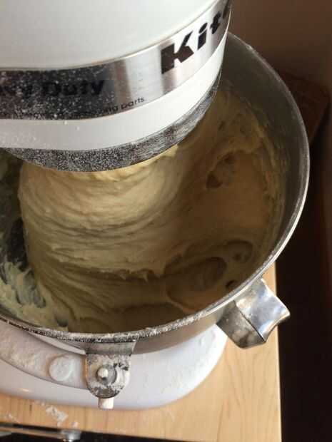 • Amasar poniéndolo bien en velocidad 2 en la KitchenAid durante dos minutos o volcar en un cuenco ligeramente enharinado y amasar a mano para seis y ocho minutos.