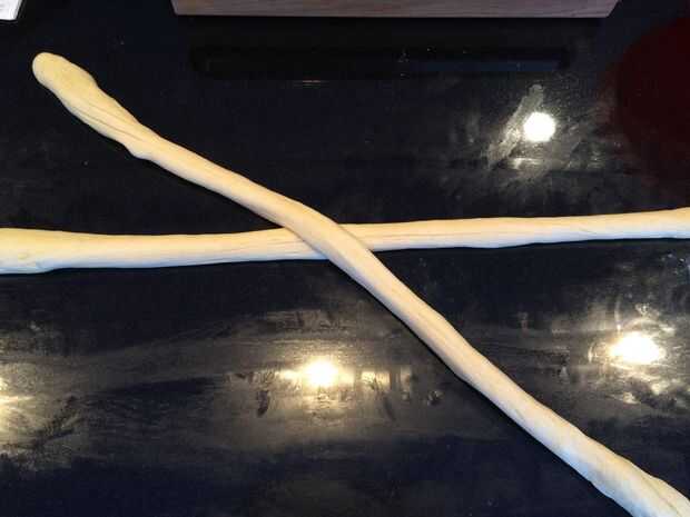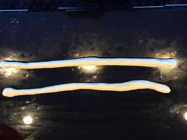 - Vamos a trabajar sobre un pan a la vez. Tomar cada una de las dos secciones y rollo cada uno en una cuerda larga. Comenzar en el centro de la masa y el rodillo hacia fuera con las manos, alargando la cuerda hasta llegar a una larga serpiente. Mis cuerdas son unos 26" cada.