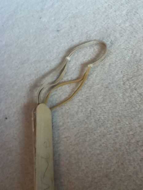 Unir tres bandas elásticas. Palillo uno extremo a un palito (o cartón más) luego el otro. Pega otro palo o pedazo de cartulina del mismo tamaño en la parte superior. Hecho!