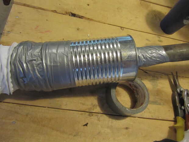 La forma más sencilla para unir conductos flexibles de vinilo con una pesada barra de acero es utilizar una lata de acero de diámetro de 4". Las latas que he utilizado vinieron de grande 46 oz latas de V-8, pero estoy seguro que hay otras marcas que hay que usan. ¿Alguien acuerda de Hi-C latas? Chico, debo estar poniendo viejo.