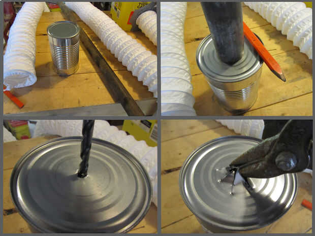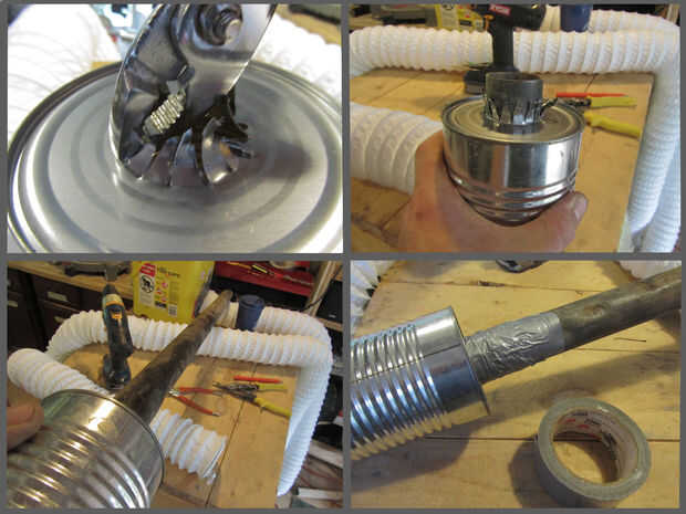 El proceso es sencillo; rastro del polo en el extremo cerrado de la lata. Perfore un agujero en el centro, luego utiliza unas tijeras para cortar cuñas (unos 12) y dejarlos con bisagras en la lata. Alicate para doblar las bisagras hacia fuera (cuidados, aristas, guantes). Ahora deja un agujero para la varilla de acero a rosca. Asegúrese de dejar una longitud interior de la lata para la estabilidad. Envuelva la cinta alrededor de los bordes expuestos, irregulares para garantizar a la barra (use cinta liberalmente). Ahora simplemente inserte el extremo de los tubos de vinilo en el otro extremo de la cinta puede y el conducto que cierre.