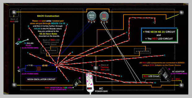 La salida del circuito de lámpara de neón se compone de 10 longitudes de cable de par trenzado rojo y blanco que pasan a través del Panel de plexiglás, así como a través de los tableros de PC donde se sueldan a la lámpara de neón / pares paralelo de condensador montado por encima de las tarjetas de PC.