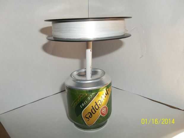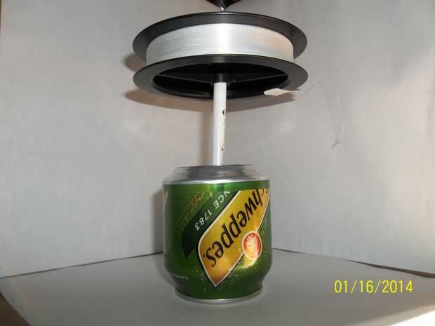 Corte la lata en la mitad, cortando cualquier astillas afiladas. Eliminar toda la humedad restante del interior teniendo cuidado de no cortarse. Ponga cinta sobre el agujero potable en ambos adentro y hacia fuera. Se trata de la parte inferior del huso. Poner canicas o cargar material en esta parte de la can. En la otra mitad, haga un orificio en el centro y trabajar hasta que se lo suficientemente grande como para adaptarse a la pluma. Poner 4 pliegues en el lado cortado de la can para ayudar en la colocación en la parte inferior. Ahora juntar las dos piezas de puede poner la pluma en el centro y colocar el rollo de Fireline en la pluma. Viola! Un husillo de Fireline.