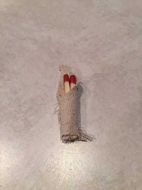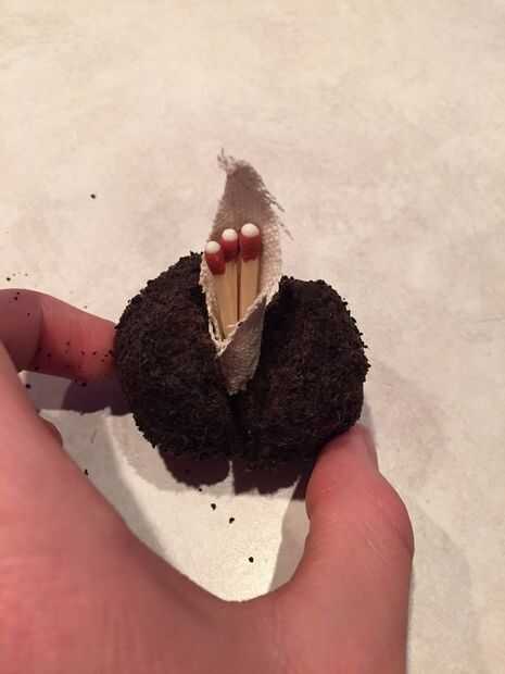 Mida 1/3 de taza de esta mezcla y apretar en forma circular. Se debe liberar una gran cantidad de agua y ser aproximadamente del tamaño de una pelota de golf. Luego cortar un trozo triangular de tela y recortar tres huelga UCO en cualquier lugar coincide con la longitud ligeramente inferior a la altura de su firestarter. Recomiendo altamente usar huelga UCO dondequiera fósforos porque trabajan mucho mejor que otras marcas de huelga dondequiera coincide con que he tratado. Entonces estos tres en el paño triangular del rodillo y split apart el firestarter, poner el laminado en paño con partidos en medio de ella. Luego aprete el firestarter detrás. Necesitará ejecutar firestarter bajo agua para que sea suave para que pueda trabajar espalda dar una vuelta juntos.