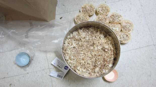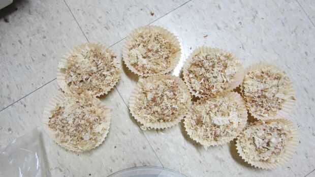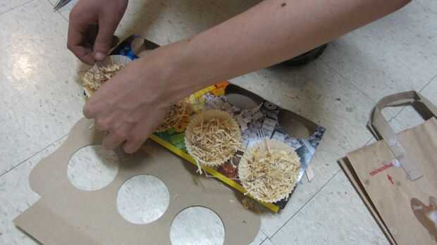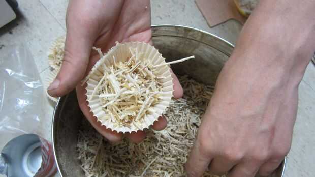 Tomar unas pequeñas virutas de madera y colocarlos en cada envoltura de la Magdalena. Una vez que todos los que necesita preparados, colocarlos en una lata del mollete, o algo que puede mantener la forma de la Magdalena cuando empieces a verter la cera de parafina.