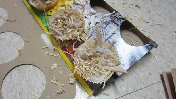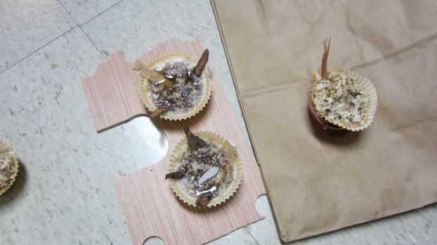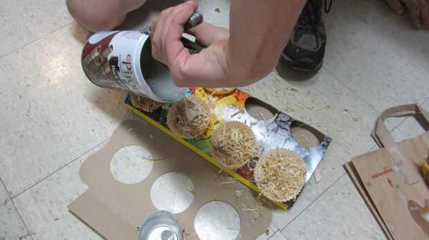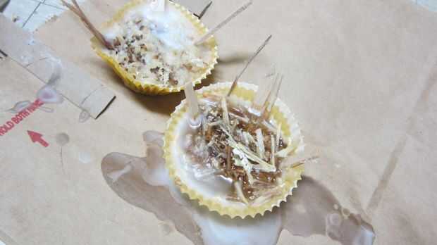 Cuidadosamente tome unas tenazas o pinzas y recoger el poder con su cera de parafina derretida y Vierta lentamente la cera en los moldes de Magdalena. La cera no se solidificará inmediatamente! Pero eso está bien, que usted querrá tomar trozos grandes de madera y colocarlos alrededor del exterior de la Magdalena.