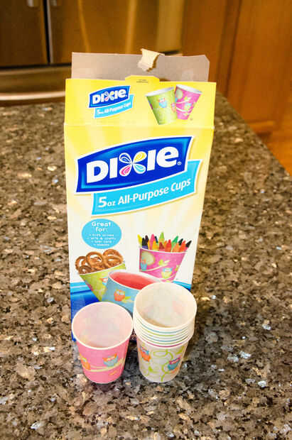 3. tazas Dixie. Dixie hace en tamaños de 3 oz y 5 oz. Cualquiera funcionará. Me prefieren de 3 oz, ya que cuestan menos y funciona igual de bien. Sin embargo, lo que ves en las fotos que siguen son 5 tazas onzas (comprados por error).