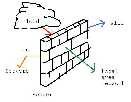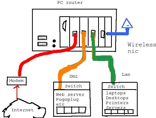 Lo que queremos hacer es aislar a nuestra red doméstica desde internet. El router que estamos construyendo protege. Pero hay varias maneras que podemos conectarnos. El más simple tiene dos piezas un cable (conocido como la red roja) va a internet y un segundo cable (conocido como la red verde) va a la red doméstica. pfsense profides todo el software para permitir que esto suceda. También podría tener dos redes adicionales. uno para wifi (red azul) por lo que puede ser independiente de su red por cable y luego uno de la red (DMZ o zona desmilitarizada) naranja para dispositivos actuando como servidores que necesitan acceso directo a internet. para nuestros propósitos, vamos sólo a establecer la red verde y el rojo.