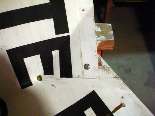 Marcó el signo en dos mitades cuadrados de 2'. Esa línea de centro, hice dos juegos de triángulos dos 45-45-90 con patas de 5", 5" y 7". SNIP por eso Centro de la línea 5". Luego cuidadosamente la línea encima de la hipotenusa con el borde de la mesa de trabajo y un martillo hacia abajo con el mazo. Para obtener la curva más limpia, golpeó justo en el borde, no hacia abajo en la parte inferior de la pieza. Repita para los cuatro triángulos.