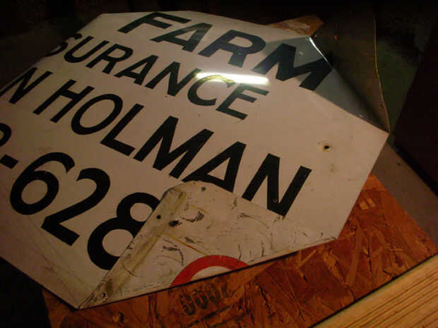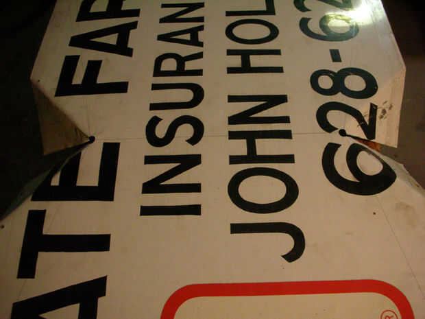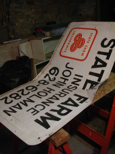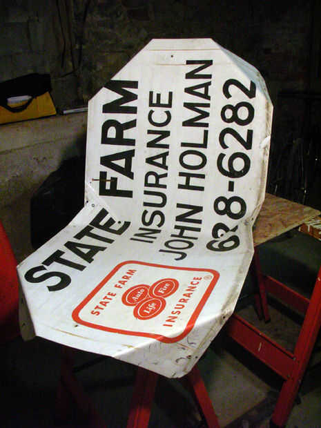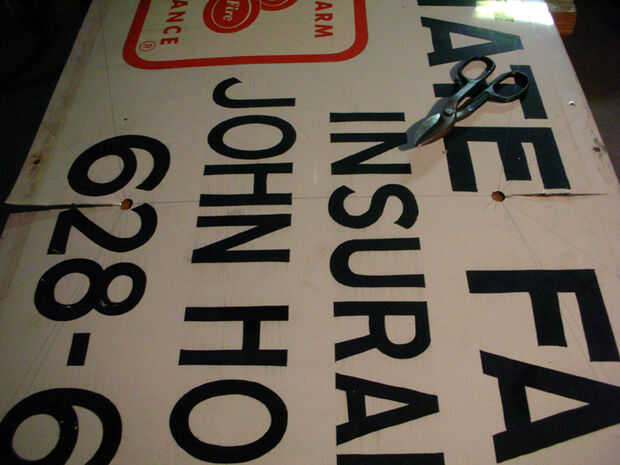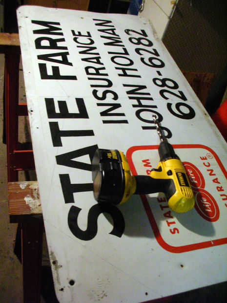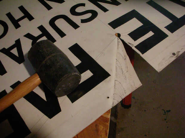 Por último, doblar todo por la mitad a lo largo de la línea de centro tirando juntos los triángulos de la línea central hasta que se superponen completamente. Perfore un agujero a través de ambos y el perno a través de mantener el signo de esa manera (ver la última foto de la intro a ver esos tornillos cerca).