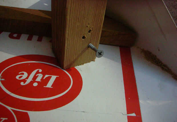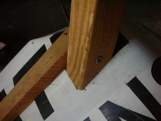 Para ayudar a colocar las piernas, corrí dos rieles de adelante a atrás. En primer lugar, con cinta adhesiva debajo de la señal, luego Dale la vuelta, perforar agujeros y tornillo con tornillos drywall. Es importante perforar agujeros porque la madera es fina, viejo y seco, y fracturas podrían ser fatales.