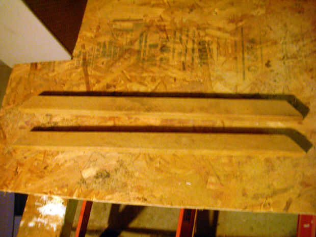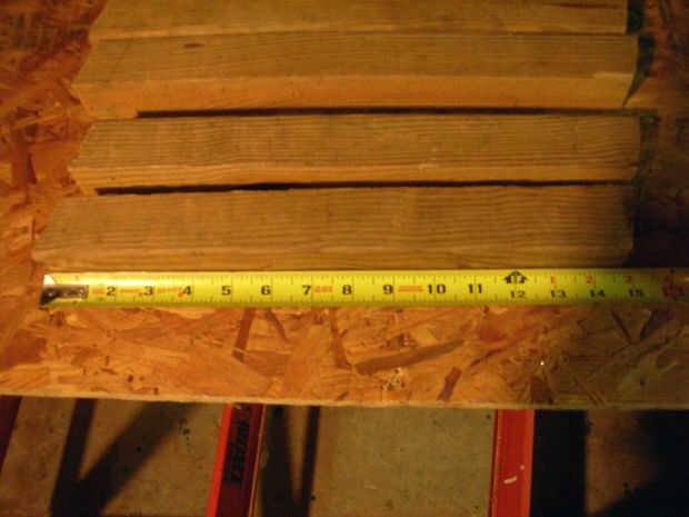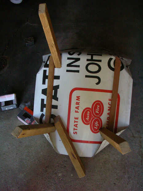 Cada uno se hizo de un cartel que había sido arrancado de una 2 "x 4", hasta aproximadamente 1-3/4" cuadrado de sección transversal. Para obtener los ingletes adecuado para que los pies golpear el piso, he apuntalado la señal doblada en algunas cajas y sólo comentarlo alzando la madera. Perfore un agujero en el pie de cada pieza, dos pulgadas arriba desde el fondo, para cierta tensión Cruz-apoyar más adelante.