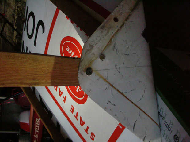 Poner otro tornillo, digamos un 2-3" tornillo de la cubierta, a través de la señal en la veta. Doblar las aletas triangulares y enroscar en las patas delanteras también. No te preocupes si las piernas están aún tipo de disquete en este punto, nos encargamos de eso.