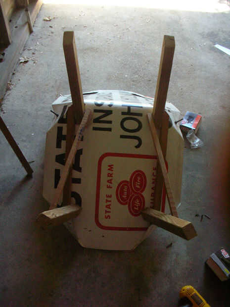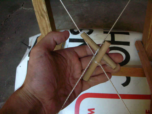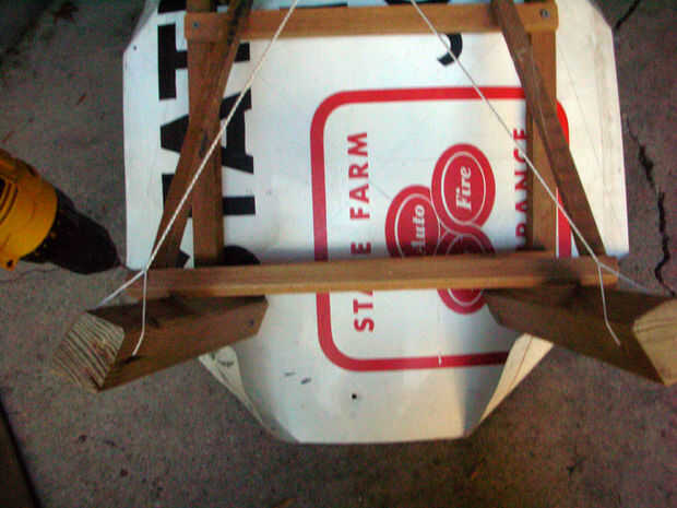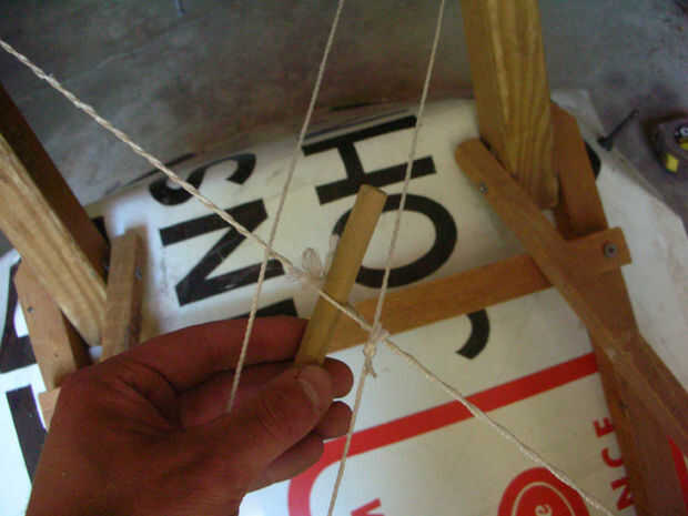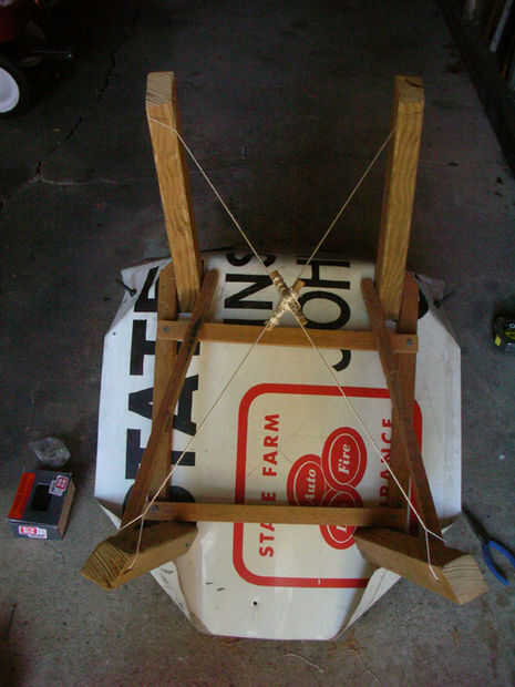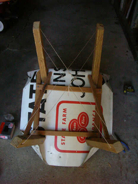El tirante de tensión que se ejecuta en una X al final de la baja de las piernas se hace con hilo de nylon. Alambre del lazo o cuerda funciona igual de bien. Este apoyo hace un par de cosas: evita la tendencia de las piernas para difundir hacia afuera desde el centro cuando se cargó, aprieta las piernas contra las juntas superior donde se unen a la señal, y puede ejercer mucha fuerza sobre la silla todavía flexible, enderezando así los pies golpear el suelo uniformemente.
