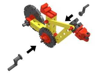 Arreglar una rueda del engranaje T30 cerca del centro de un Clip de árbol 45 con un collar de eje plana y una tuerca del cubo. Inserte el ensamblaje en el segundo bloque 15 con agujero. Fijar el engranaje mediante la adición de manivelas a cada extremo del eje. Añadir mangas de cojinete en cada manivela para una suave acción de pedal.
