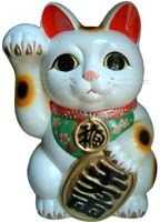 La entrada de Wikipedia sobre el gato de la suerte: "el Maneki Neko ("Beckoning Cat"... también conocido como acogedor de gato, gato de la suerte, dinero cat o gato de la fortuna) es una escultura japonesa común, a menudo hecha de porcelana o cerámica, que se cree para traer buena suerte a su dueño... En el diseño de las esculturas, una pata derecha levantada supuestamente atrae dinero, mientras que una de la pata izquierda levantada atrae a los clientes."