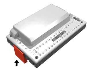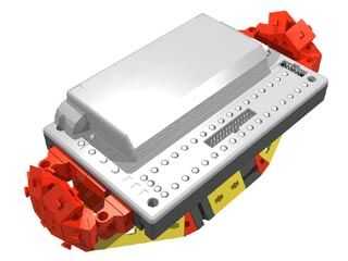 Añadir el ensamblaje de la batería al fischertechnik Robo Interface deslizando las clavijas de la placa de montaje en las ranuras centrales en cada extremo de la interfaz de ladrillo.