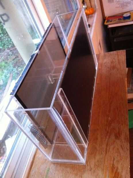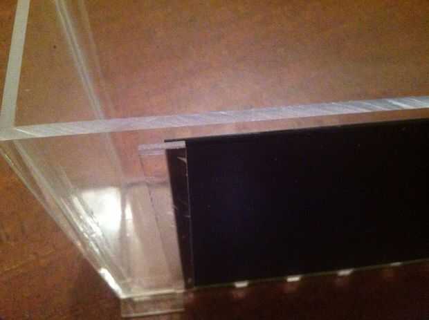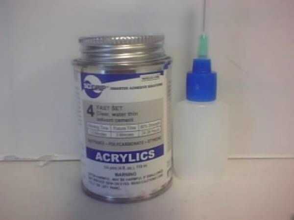 El pegamento es IPS Weldon-On #4 disolvente acrílico plexiglás pegamento. Usted necesita comprar el aplicador. El aplicador es sólo una botella de plástico pequeña con una punta de la aguja para ~ $2 que se aplica el agua como pegamento a las superficies de juntas a tope. Peso 12 horas y es sólido, soldadas con autógena juntas.