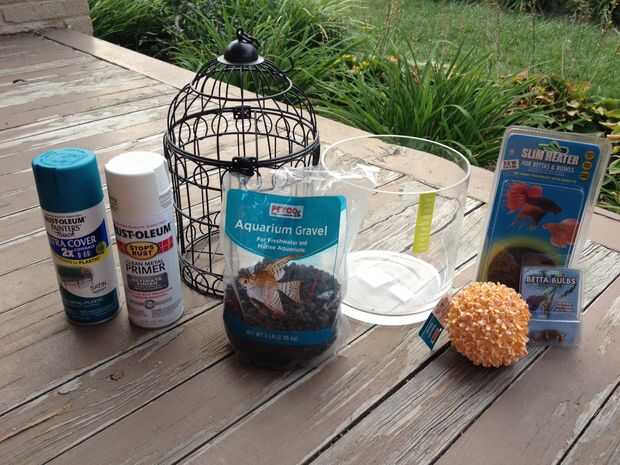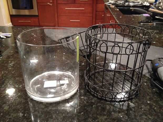 Escogió la ruta del ready-made y consiguió mis jaulas a Michael y dos cilindros de vidrio en TJ Maxx. Tengo suerte con el mi primera jaula y un jarrón de cristal que se encuentra en y ajuste perfectamente (no mostrado).