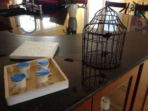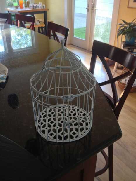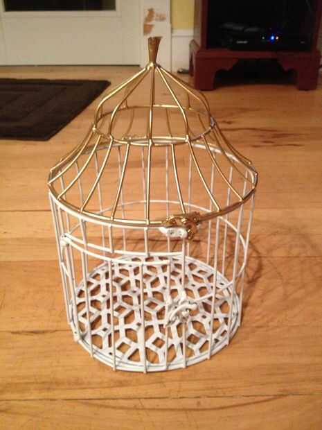 ¡ UF! Tuve más consejos que me di cuenta. Mi plan original, inspirada en el cristal de imitación aves encima de esta jaula, era hacer una capa superior de oro. Quité el pájaro desde arriba (atornillado apagado y grabó las roscas con cinta de pintor) y cebada (las primeras y segunda fotografías, junto con otro proyecto que pintaba en el tiempo). Después de mi primer capas, sin embargo, yo estaba cavando el blanco mate y no estaba seguro de ir todo oro. Decidí que la mirada de la jaula elevada si acabo de hacer la tapa de oro. Siempre pude pinto el oro de abajo si no me gustaba dos tonos. He usado diario asegurado con cinta de enmascarar para proteger la parte inferior de la jaula de over-spray y terminó con el trabajo de pintura terminado en la tercera foto.