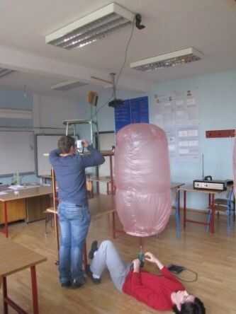 Volumen del globo de 270 litros calentar con pistola de aire caliente a una temperatura de 100 ° C y entonces dejé que levantó en el sensor de velocidad que montado en el techo del aula.