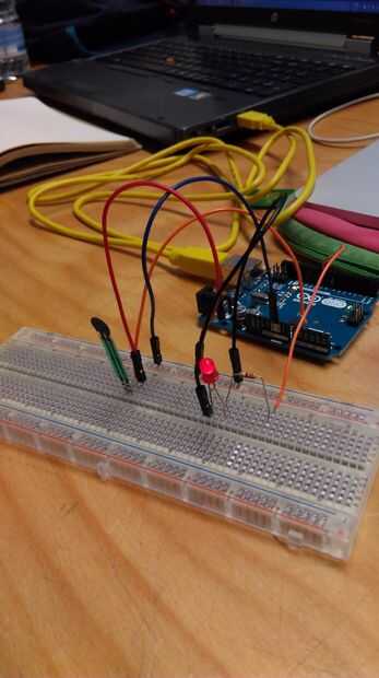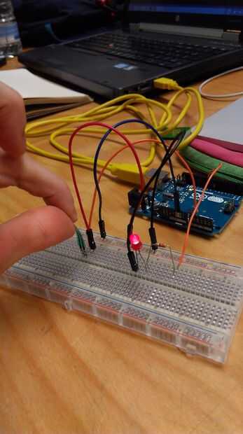 Comenzamos con solamente una luz de prueba. Al escribir el código de tal manera, hemos sido capaces de mostrar el cambio en la intensidad de la luz cuando se pulsa el sensor.