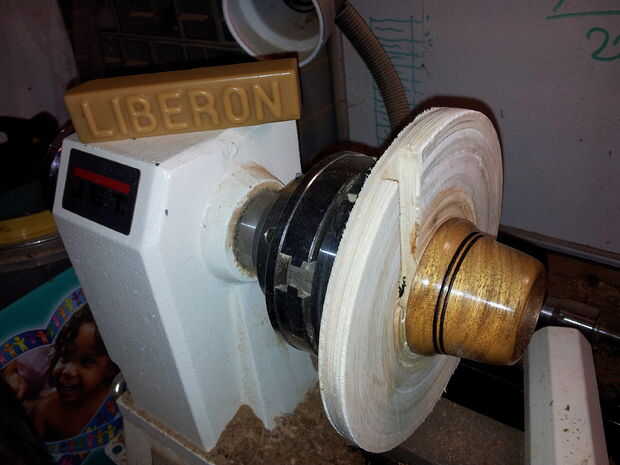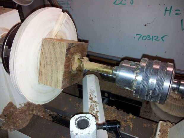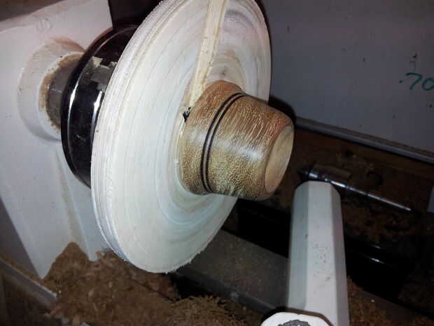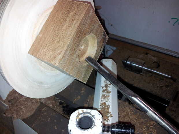 La base se convirtió en el torno. Lleva pieza de madera y taladro y 8 mm agujero * y Monte en un mandril de tornillo. A continuación, utilizando un fostner broca en el taladro de banco de cola un agujero de 30 mm * 10mm en el centro de la madera. Abrir este agujero con un raspador plano caja terminó así su cristalería es un ajuste (no apretado como espacio es necesario para pegamento). Ahora a la forma exterior, primero mediante un husillo desbaste gubia seguido pero una gubia de huso para introducir de una forma agradable. A continuación, arena de grano 400. Yo elegí a embellecer con dos líneas quemadas poniendo dos ranuras en v en el uso de un cincel para sesgar y luego con alambre fino crear la marca de la quemadura. Otra luz arena para limpiar los bordes de línea quemado y luego aplicar sellador y cera dura. Fondo de arena plana una vez retirado del torno
