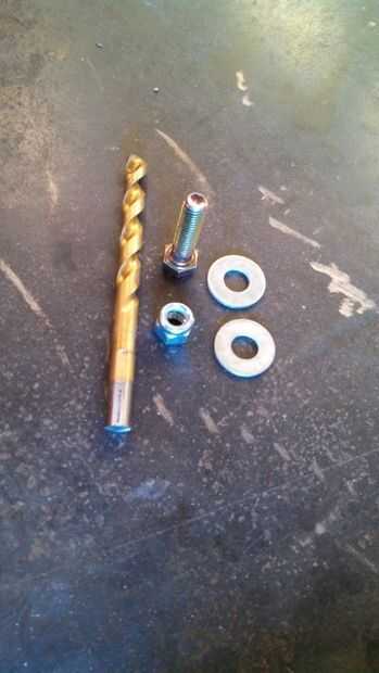 Un taladro, un tornillo grado 8 de 3/8" 16 1 y 1/2, una broca de 3/8, una tuerca de aeronaves (cerradura) y dos arandelas 3/8.