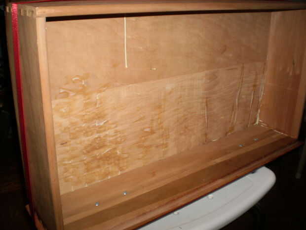 La más delicada pieza iba a ser la parte delantera. Tuve que "desliza" en el lado; no es un problema para un lado, pero por el otro, puesto que ahora es tope contra la parte inferior, era un poco más difícil. Tuve que separar cuidadosamente el lado cerca de 3/4 de pulgada (aprox. 19 mm) de la base, deslice la parte frontal en su lugar y traer la parte en su lugar... sosteniéndolo todo el tiempo, todos juntos (socio sería muy útil aquí). Si el fondo no había sido deformado, esto habría sido bastante fácil.