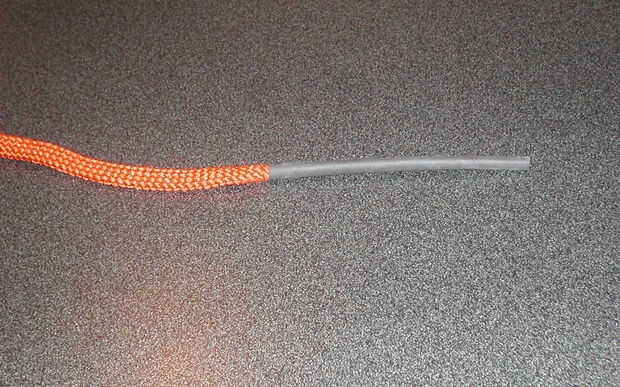 Deslizamiento fin del calor tubo de contracción en el extremo deshilachado de los cordones de los zapatos. Me cubre la punta con unos 3/4" de la tubería y luego recortar el excedente con una tijera.